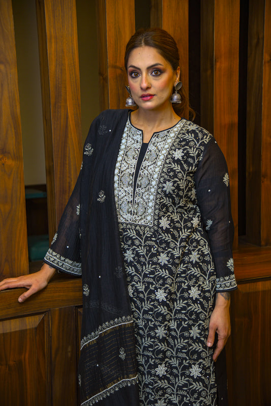 Banarasi Chanderi Anarkali (Black Symmetric Pattern)