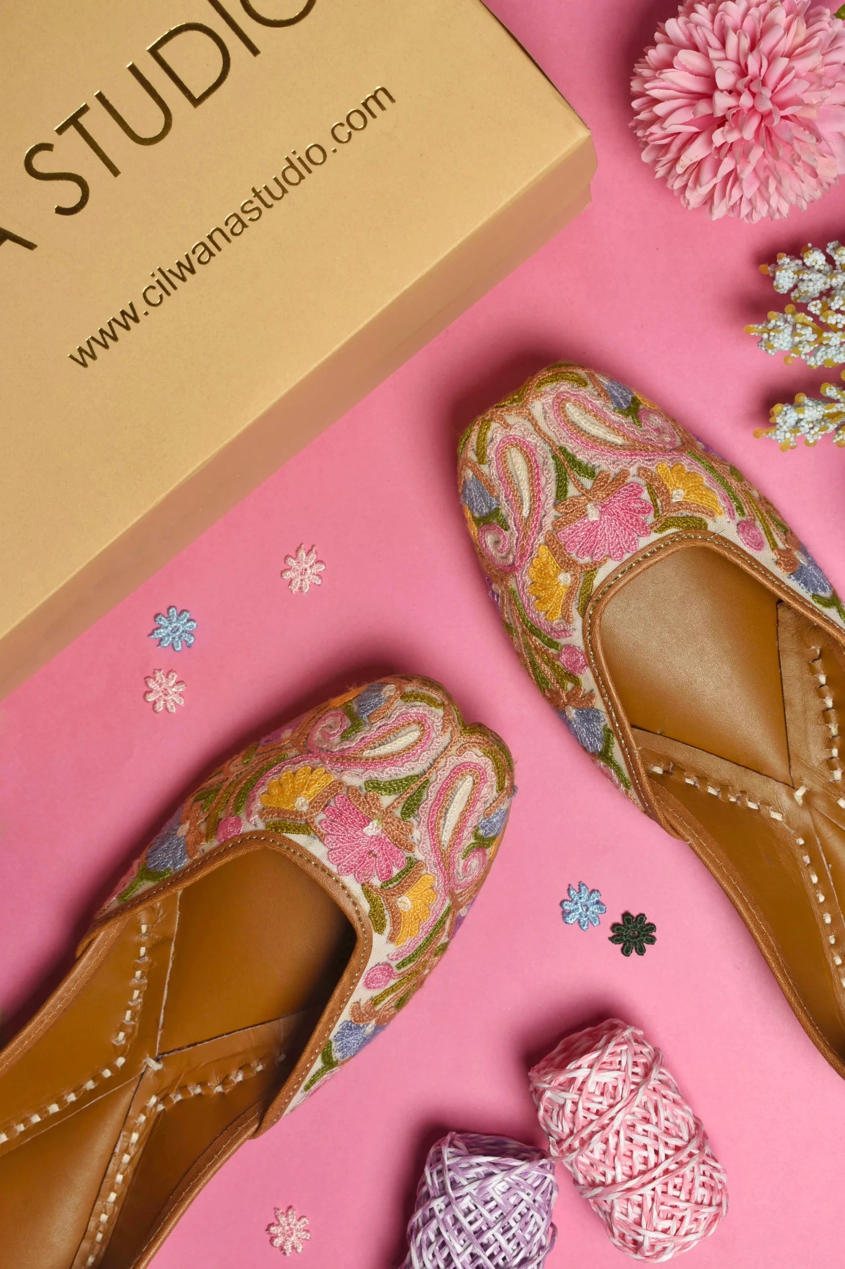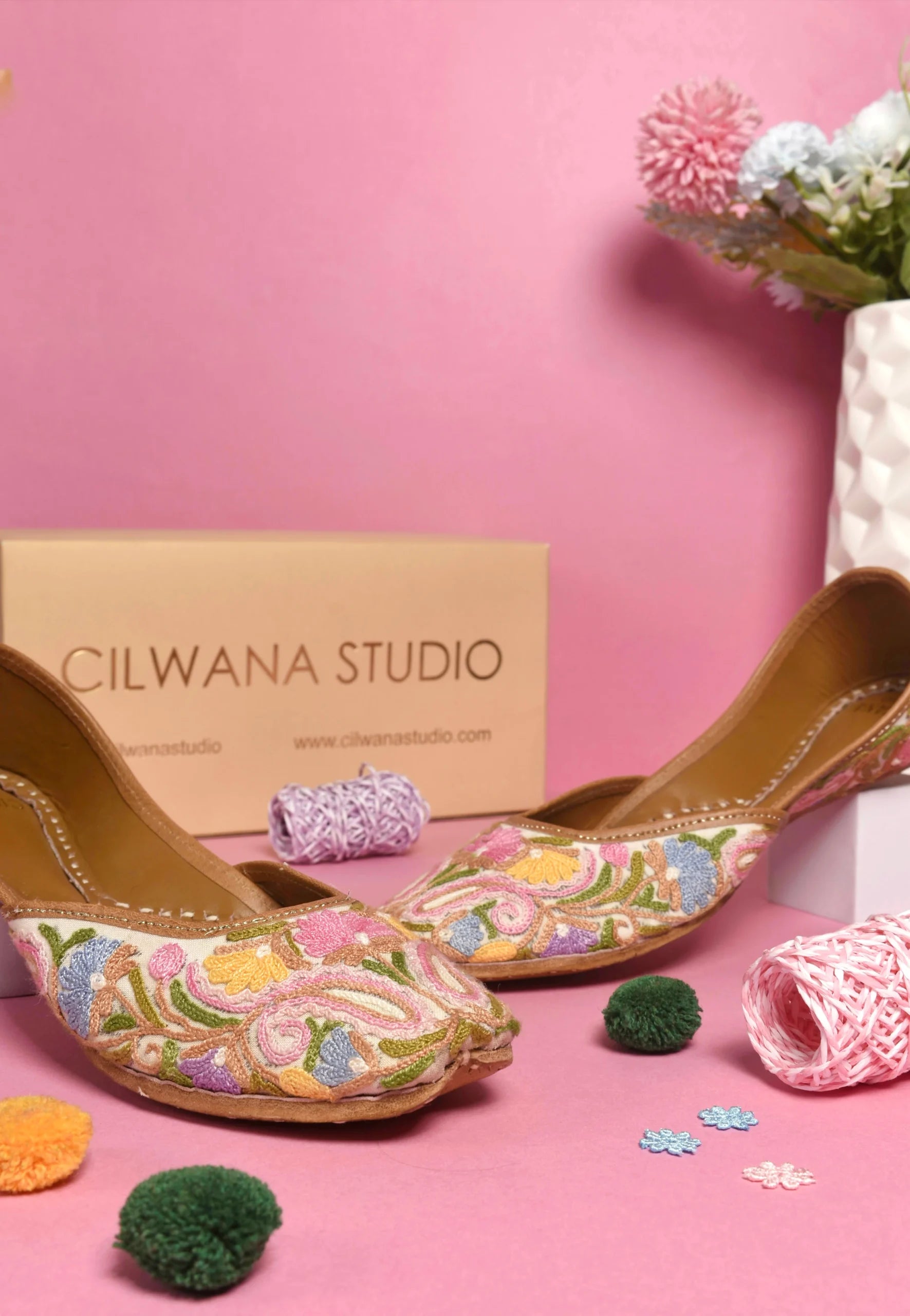 Experience the epitome of craftsmanship with our handmade double cushioned leather juttis featuring intricate Kashmiri Aari work. Each pair is a testament to exquisite artistry and attention to detail, offering both style and comfort. Elevate your footwear collection with a touch of traditional elegance and unmatched quality.