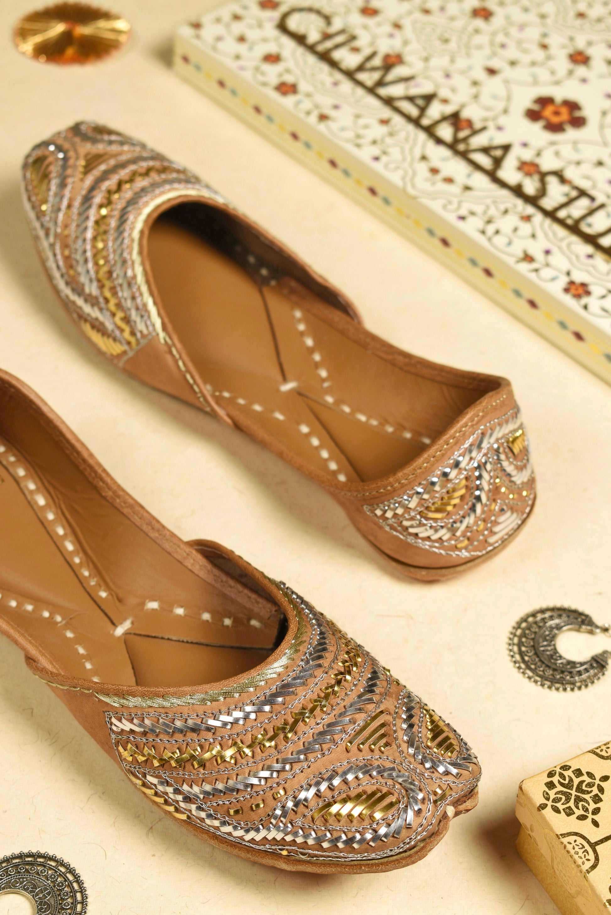Elevate your style and comfort with our handmade double cushioned Silver and Golden Pitta Almond leather juttis. Crafted with precision and care, each pair embodies luxury and durability. Step out in elegance and experience unmatched comfort with every stride.