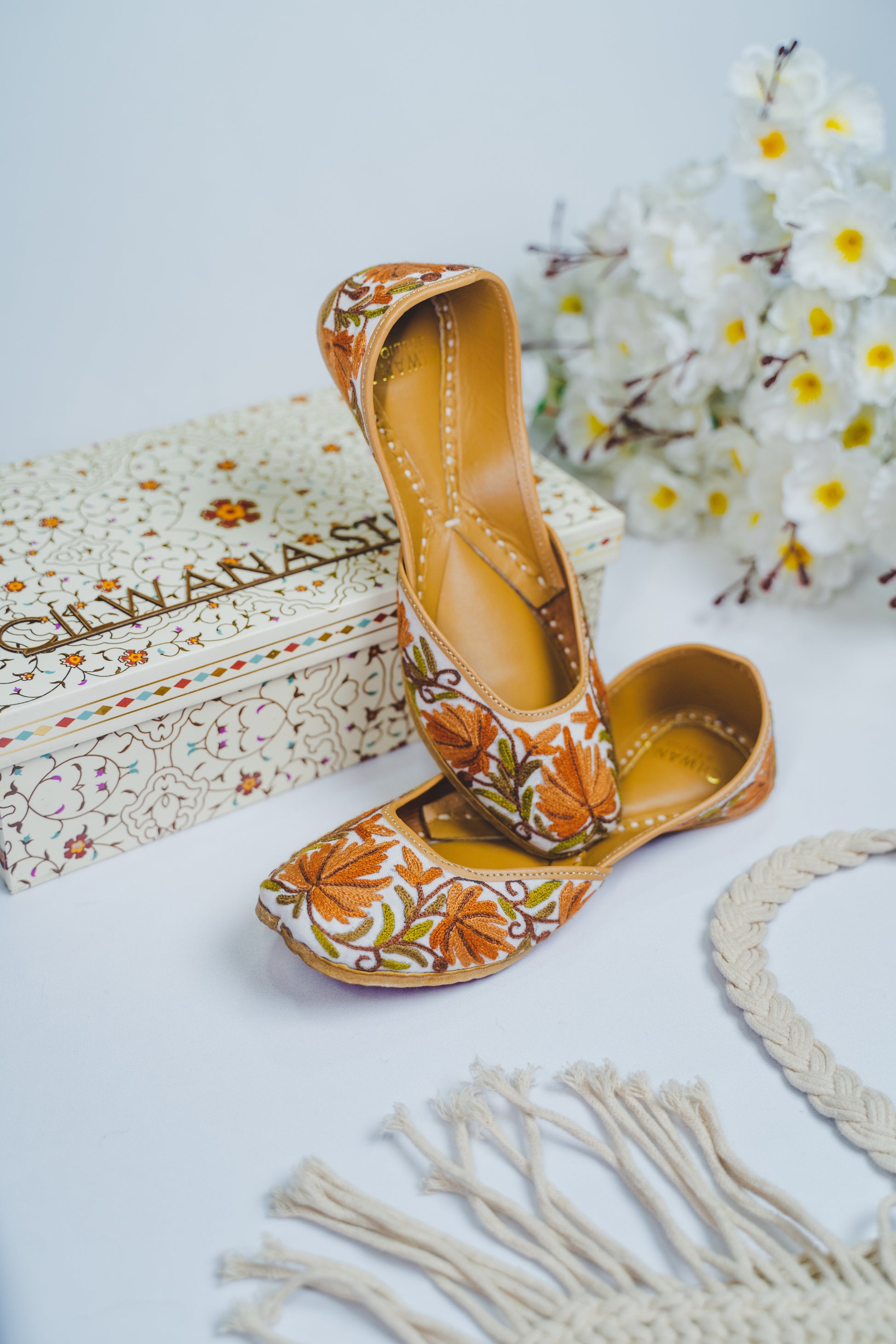 Experience the epitome of craftsmanship with our handmade double cushioned leather juttis featuring intricate Kashmiri Aari work. Each pair is a testament to exquisite artistry and attention to detail, offering both style and comfort. Elevate your footwear collection with a touch of traditional elegance and unmatched quality.