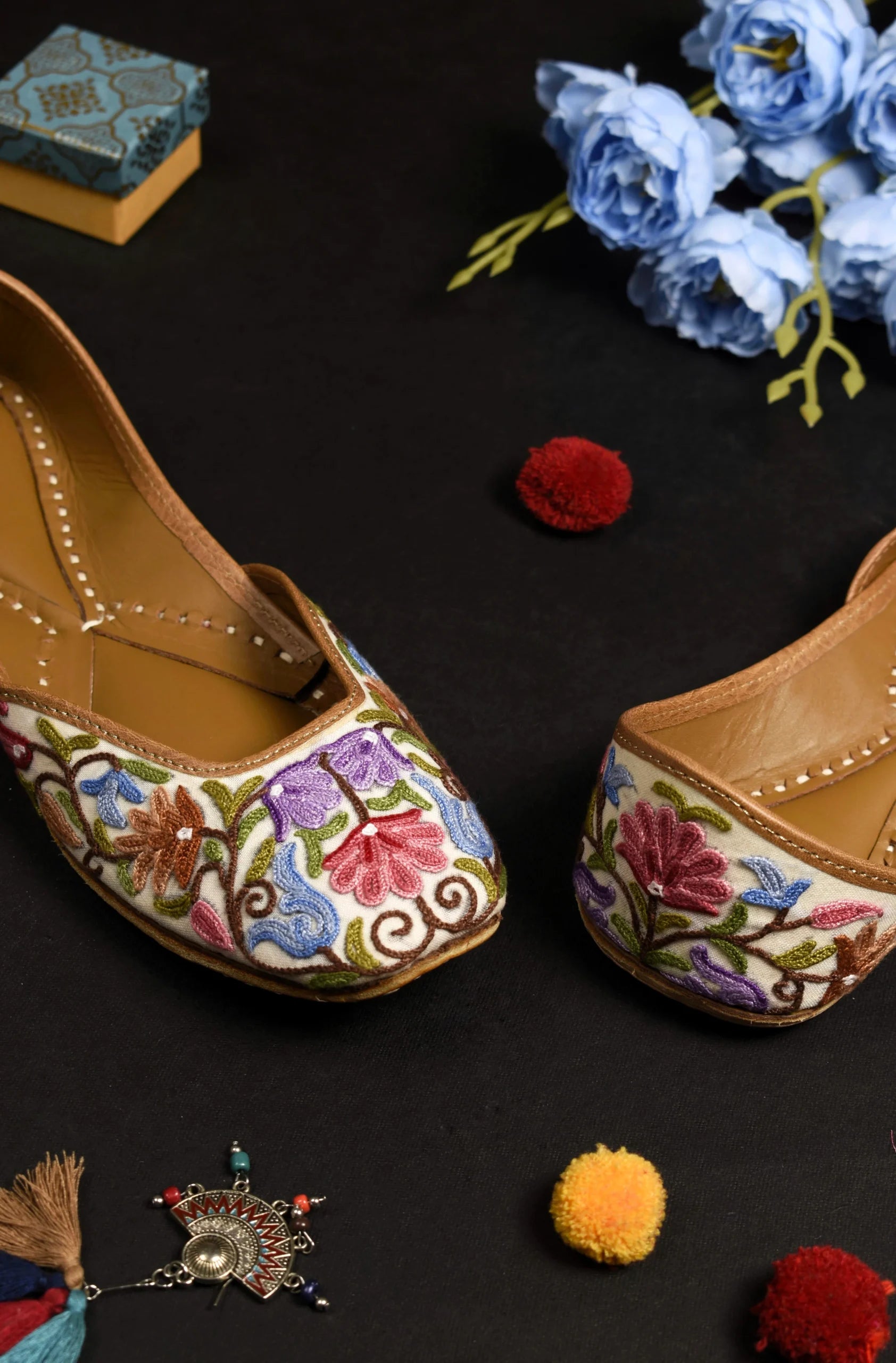Experience the epitome of craftsmanship with our handmade double cushioned leather juttis featuring intricate Kashmiri Aari work. Each pair is a testament to exquisite artistry and attention to detail, offering both style and comfort. Elevate your footwear collection with a touch of traditional elegance and unmatched quality.